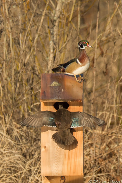 DeleteNo question. The female duck entering the box in both photos was the same duck - but it was two separate events in the photo stream. I was obviously confused. Thank you for helping me to learn to pay attention to more than just the female duck's facial characteristics. The faces do not provide much help when identifying ducks from behind, but that missing feather was a clear and obvious clue. Thank you!