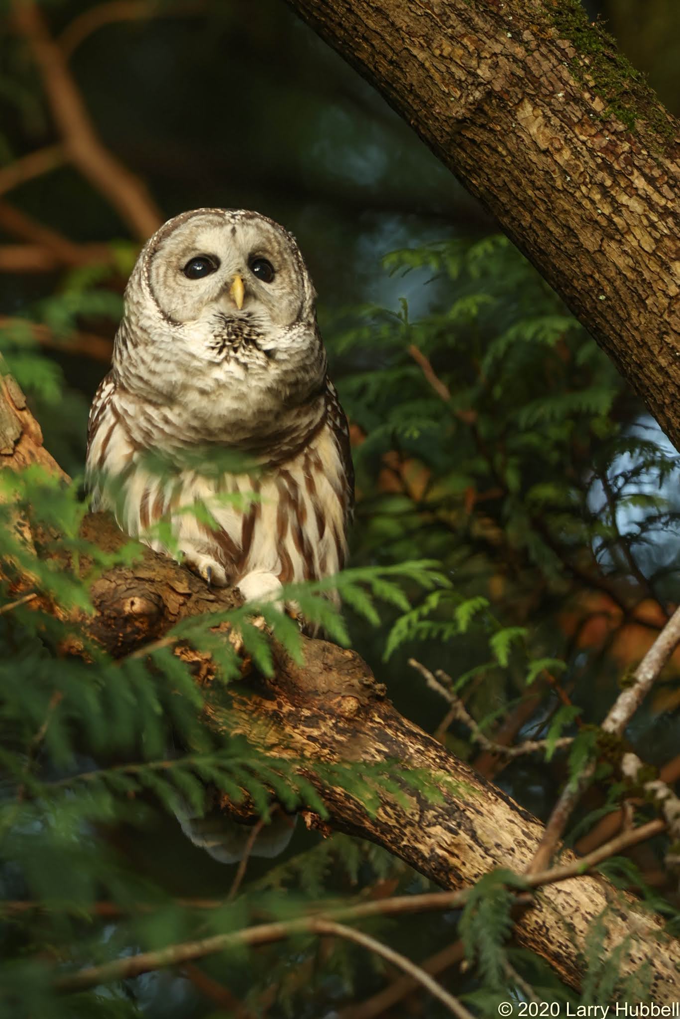 Adult Barred Owls tend to stay undercover and to focus on what is below them. They often sit near the water's edge as darkness falls. They wait patiently for a small creature to reveal itself. Then, when the prey looks the other way the owl spreads its wings and silently descends. If this owl spotted viable prey overhead in the trees the odds of success would quickly diminish while the owl attempted to gain the necessary elevation. The smaller creature would be likely to notice its approach and easily scamper away to safety.