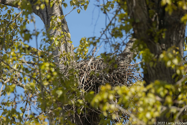 Susan had mentioned that she thought she might have seen two young in the nest. This fuzzy photo is my first proof. In the front left, one eaglet's head was obvious in the sunlight while behind it the top of a second head can be seen in the shadow. A third eaglet is possible but unlikely.