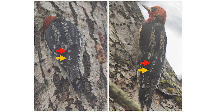 The photos above, for example, were taken ten days apart and both birds were in the reclining Willow next to Duck Bay. Even though the angle is slightly different and the wings are held a bit differently the white tips of the visible tertials look remarkably similar. (I also have additional photos that show these same patterns on the Duck Bay Sapsucker.) As the second photo illustrates, depending on how the bird holds its wings, not all four feather tips are visible all of the time.